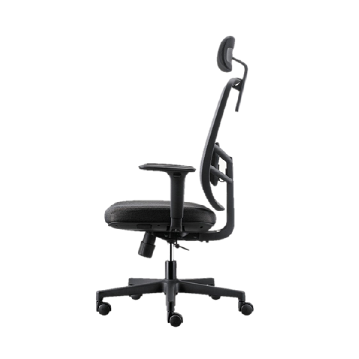Contoured Fabric Seat: The plush seat is upholstered in durable black fabric, offering a soft yet supportive base that maintains its shape and comfort throughout the day.